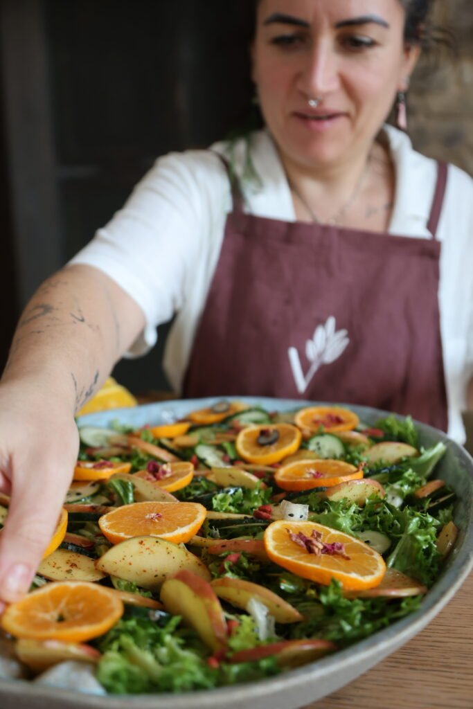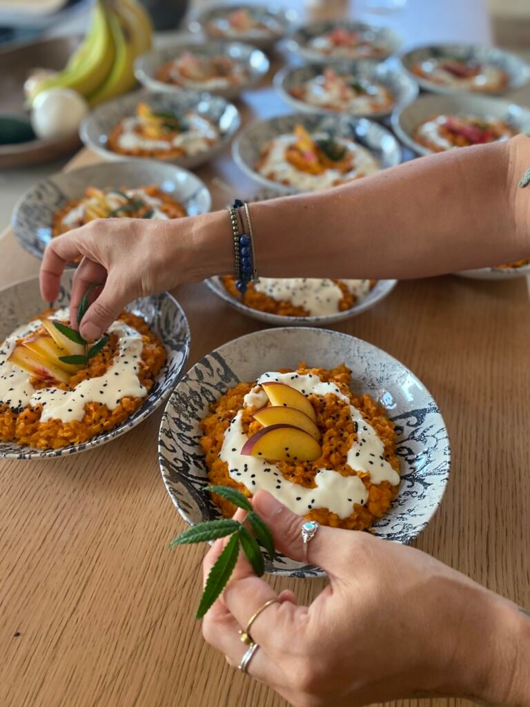Los menús que creamos se basan en ingredientes ecológicos, de temporada y de proximidad, cuidadosamente seleccionados para ofrecer una alimentación saludable, sabrosa, nutritiva y estéticamente cuidada. Cocinamos desde la simplicidad, la intención y la presencia, entendiendo cada plato como una forma de cuidado y expresión.